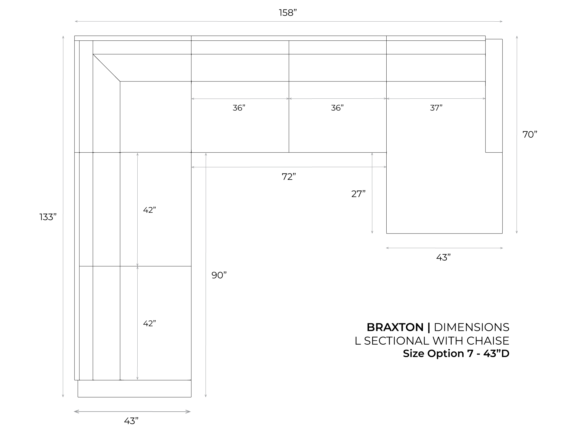 Everything our customers love about our original Braxton Brompton Leather Sofa, in a roomy L Sectional with a chaise on the end. This sectional is available in 2 Size Options, and 2 Depth Options, allowing for 4 possible configurations of this sectional. The Chaise can be on either side, just note the dimension images below and select to make as shown, or to reverse the sectional in the options. As with the entire Braxton Collection, this sectional with chaise is tailored in some of the world's elite leathers, fitted with premium feather & down fill seating and built with a re-inforced hardwood frame. Your choice of Heavy Gauge Sinuous Spring Suspension or True 8-way Hand Tied Suspension for the ultimate in longevity and durability. Picture shown is Size Option 2, in 43" depth. Pieces used: 1 RAF Chaise + 1 55" Armless Love Seat + LAF Corner Sofa. We can build this Braxton Leather "L" Sectional to meet your needs. There are so many ways we can customize this for you, so if you don't see a configuration that will work for you, call us at 1.877.888.7632 and our specialists will work with you to create any custom configuration you need! You can also learn more on our Customization page